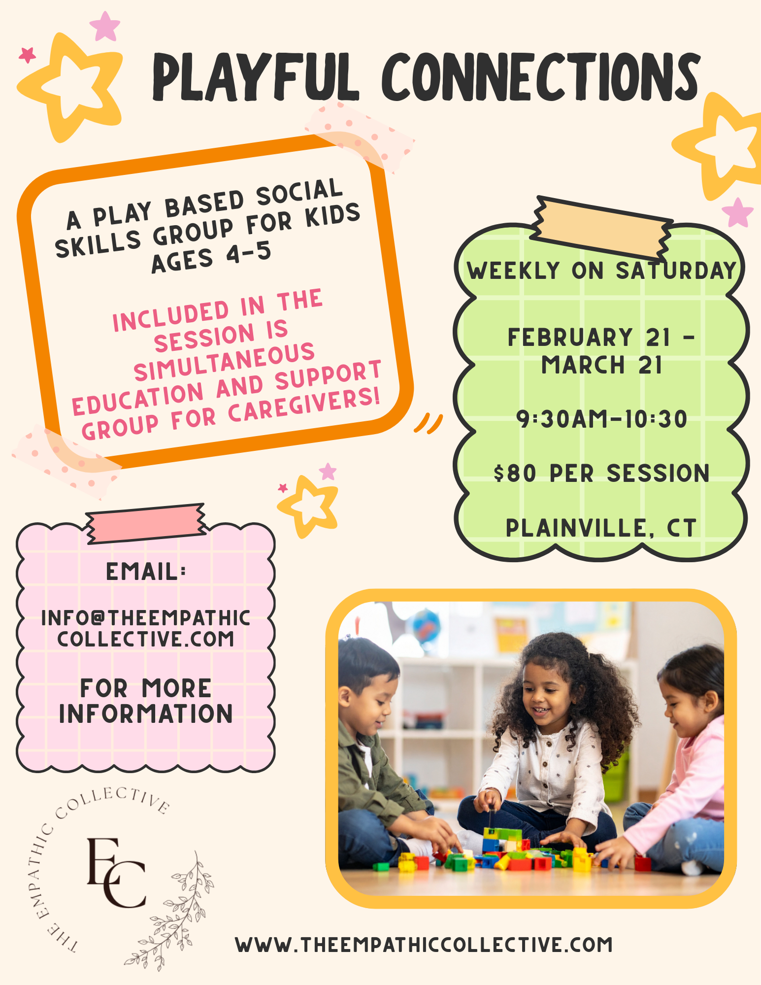 At the Empathic Collective, we offer supportive, engaging social skills groups designed to help children and teens build confidence, improve communication, manage their emotions, and form meaningful connections with others. Our groups provide a safe, structured environment for participants and are designed to meet their unique developmental needs. We use a combination of evidence-based approaches, including art, role play, collaborative games, and guided discussions to encourage self-awareness, emotional regulation, and positive social interactions.